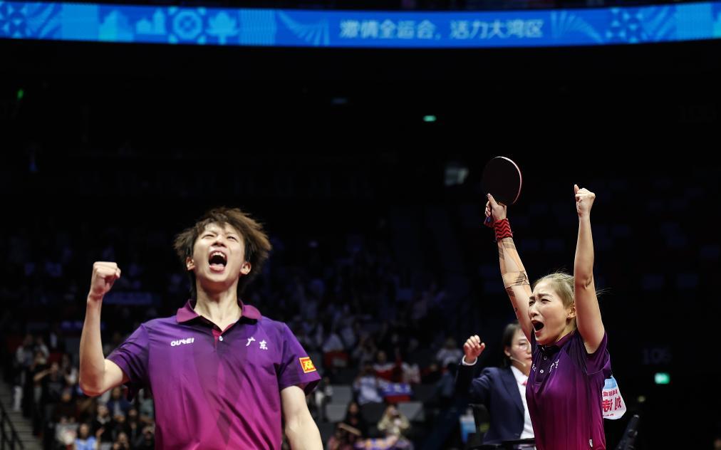 新华社澳门11月14日电(记者郭雨绮、岳然然)14日,第十五届全运会乒乓球混双决赛拉开帷幕。广东队林高远/刘诗雯以4:2战胜江苏队陈远阿努/奎曼,夺得金牌。老将马龙、许昕在团体赛中取得开门红。 11月14日,广东队林高远(左)/刘诗雯组合庆祝胜利。新华社记者孙凡跃拍摄了混双决赛第一场比赛。两对组合从8:8一直战到13:13,陈媛妍/奎曼以15:13取得领先。第二局,两人以11:8再下一城。第三局和第四局,林高远/刘诗雯组合以11:8的两分扳平比分,两队重回起跑线。第五局,双方战成2比5,此后广东队逐渐扩大优势,以11胜1负:8、第六局,双方战成10平。最终,“诗与远方”组合以12:10险胜金牌。这也是34岁的刘诗雯第二枚全运会混双金牌。赛后新闻发布会上,林高远表示:“这场比赛我们遇到了很多困难,半决赛和决赛都输了,‘永不放弃’这个词在这场比赛中得到了很好的体现。”刘诗雯表示,他无法想象参加六场全运会。正是因为大湾区家乡的机会,他给了自己一个机会,就是要有耐心。 “我想看看运动员的运动生涯在哪里结束。即使他们离开了国家队,他们仍然可以找到自己的比赛场地和价值。这就是我想要探索的。”他说。 11月14日,广东队组合林高远/刘诗雯(右)在比赛中发球。新华社记者 孙凡跃 摄双打铜牌争夺战在两对辽宁组合之间打响。袁立岑/王艺迪以4:3击败队友徐海东/陈幸同。男女团体比赛也将在当天进行。尚未到场的马龙和许昕吸引了所有人的目光。在上海队与江苏队的比赛中,徐新以3:1击败陈亚轩,帮助上海队以3:0拿下首局比赛。球队以同样的比分击败北京队和河南队。马龙搭档黄友政为北京队拿下双打首分。 11月14日,北京马龙(右)/黄友政组合将球重新投入比赛。新华社记者 梁旭 摄 作为六次参加全运会的“老将”,马龙周围都是鱼龙混杂的矿区。 “我已经很久没有参加正式比赛了。重新参加这样的比赛我会有点兴奋和紧张。”他说他觉得乒乓球在澳门越来越普及,运动环境也很好。他希望给前来观看比赛的人们留下良好的印象。女队小组赛,孙颖莎所在的河北队以3:0击败福建队,王曼昱所在的黑龙江队则在相隔五场比赛后击败了天津队。