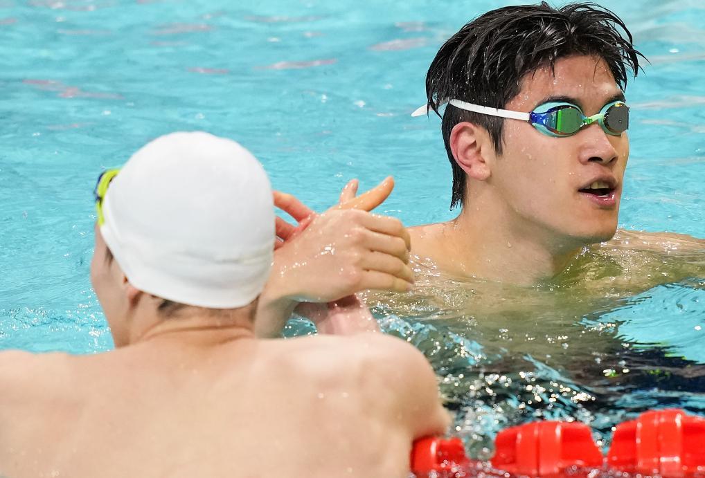 新华社广州11月14日电(记者季家栋)第十五届全运会14日将颁发29枚金牌。潘战乐在男子100米自由泳中站上最高领奖台,夺得全运会首枚个人金牌; 31岁老将王顺在200米个人混合泳比赛中实现四连冠,并在全运会上夺得第18枚金牌,继续刷新纪录。北京老将肖若腾卫冕男子体操全能冠军。 11月14日,浙江队球员潘占乐(右)与江苏队球员赵嘉跃赛后握手。新华社记者 夏芳芳 摄 在男子200米和400米自由泳决赛中连续失利后,浙江名将潘占乐终于在100米跑道上证明了自己,以48.01秒的成绩率先撞墙,完成了本次赛事的“大满贯”。赛后他说道:“有时我无法没有完全隔绝外界,但我想做的就是尽力做我自己。即使结果可能不完美,也不要后悔。”对于31岁的浙江老将王顺来说,做自己意味着不断刷新历史。在200米个人混合泳决赛中,他成为“00后”第一人,实现了该项目的四连冠,并以18枚金牌打破了自己在全运会上个人金牌总数的纪录。11月14日,广东队的林高远(左)/刘诗雯组合回球赛 新华社记者孙凡跃 第六次参加全运会的刘诗雯联手林高远,以4:2击败江苏年轻组合陈远阿努/奎曼,为广东队夺得乒乓球混双金牌。施文表示,是大湾区的主场给了他坚持下去的动力。 “我想看看运动员的运动生涯在哪里结束。”出任北京先农坛体育技工学校副校长的肖若腾凭借扎实的表现,夺得全场男子体操个人冠军。湖南名将张伯恒最后一根单杠出现失误,跌至第二位。连续两届全国运动会获得银牌。辽宁选手陈诗在女子皮划艇激流回旋单人赛艇决赛中夺得金牌。这是第一位32岁老将获得全运会金牌。 11月14日,上海队选手赵义成(左)与江西队选手黄敬杰争夺男子速度金牌赛。新华社记者 晋美多吉 一直是全运会青年跑者的精神。上海队16岁小将赵义成夺得男子组冠军对抗强大的对手的速度爬升。他明年才会参加国际比赛,并表示:“我已经准备好了,我希望他们也准备好了。”游泳比赛中,19岁的福建小将陈露英游出了2分05秒45的个人最好成绩,击败“小妹妹”余子迪和“蝴蝶女王”张雨菲,夺得200米蝴蝶冠军。 21岁的李艳以7公斤的优势击败奥运冠军李雯雯,夺得女子87公斤级以上举重金牌。 11月14日,河南队选手参加男子场地自行车团体追逐赛决赛。新华社记者吴璐摄 在其他比赛中,河南队在场地自行车比赛中斩获三枚金牌,包揽了赛事开赛以来的全部五枚金牌,全部牌都被河南队收尽。江苏队出人意料地获得了男女项目的两枚金牌。此外,“巨无霸”四川队半决赛以42分击败江苏队,将与广东队争夺女篮冠军。香港男队、江苏女队分别获得男女七人制橄榄球金牌;四川队夺得女子曲棍球冠军;男女羽毛球团体决赛均在江苏和浙江之间举行。浙江队以3:0夺得女子团体冠军,江苏队经过五轮苦战夺得男子团体金牌。